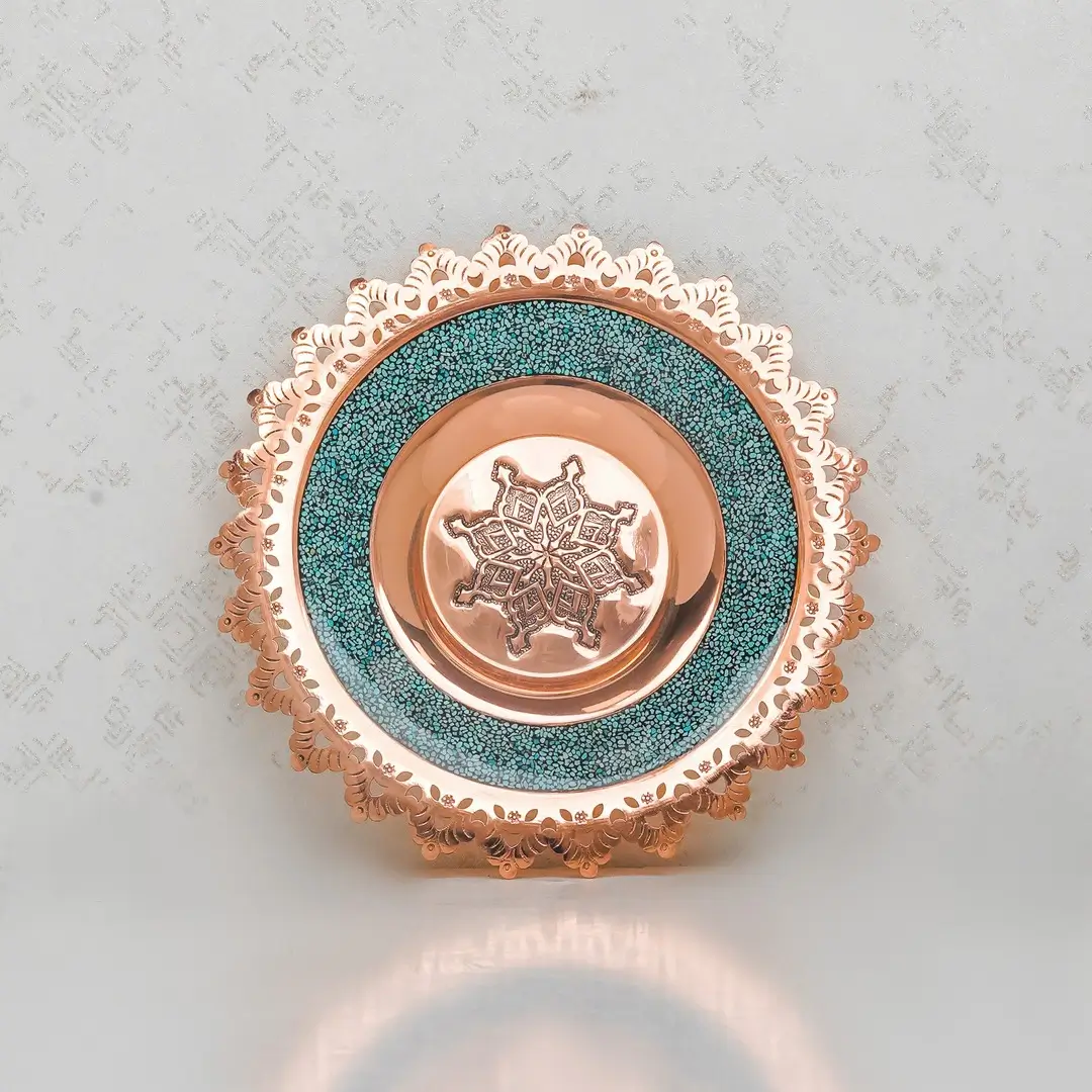 هماهنگی و هارمونی رنگ آبی فیروزهای و مسی جذابیت شگفتانگیزی به محیط پیرامون شما میبخشد. بشقاب ساده فیروزهکوبی آقاجانی با چیدمان سنگهای فیروزه به شکل نواری دایرهوار بر لبهی خارجی آن همراه با قلمزنی زیبا و اصیل ایرانی، هدیهای چشمنواز و لوکس برای کسانی است که دوستشان دارید.